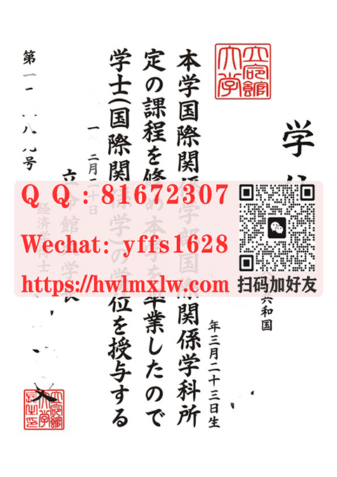 立命馆大学(りつめいかんだいがく Ritsumeikan daigaku;Ritsumeikan University)简称立大、立命馆,是一所位于日本京都市的著名一流私立大学。该校前身是日本著名政治家西园寺公望(日本第12、第14任首相)于1869年在京都皇宫创立的私塾“立命馆”。“立命”这一名称取自《孟子·尽心上》中的“夭寿不二,修身以俟之,所以立命也”一文。立命馆大学在2024年QS世界大学排名中位列日本私立大学第3名,并且在泰晤士高等教育世界大学影响力排名中获得日本国内私立大学最高评价。立命馆大学与北京大学、清华大学、香港大学、香港中文大学、新加坡国立大学、爱丁堡大学、墨尔本大学、南加州大学等全球463所著名大学&机构建立了合作协定。日本立命馆大学学士学位记毕业证样本|办理立命館大學學士學位學位記